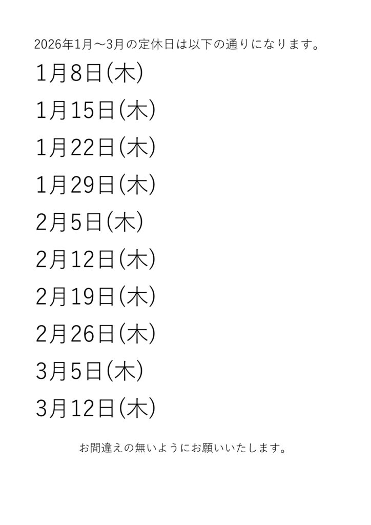 The closed days from January through March 2026 are as follows: